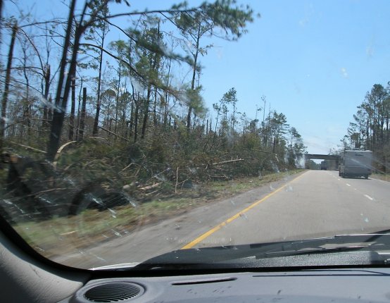 I start seeing the levels of destruction on I59 already 150 miles north of the coast: Note the snapped pine trees. And the splattered 'love-bugs' on the wind-shield ... I remember these bugs all over New Orleans when I was kid.