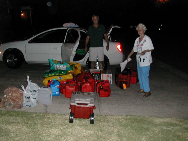 Food, water, 33 gallons of gas (plus 12 gals in the gas tank), oil, generator, chainsaw, battery, etc.... the passenger seat, the back seats, the trunk is full: almost 1/2 ton of stuff.